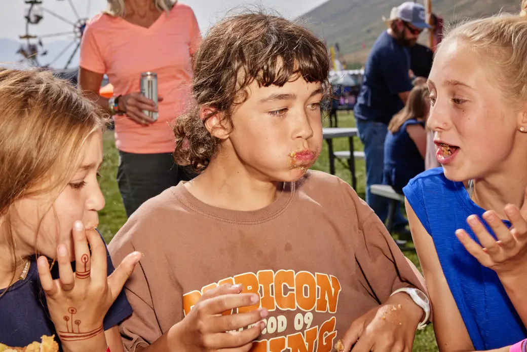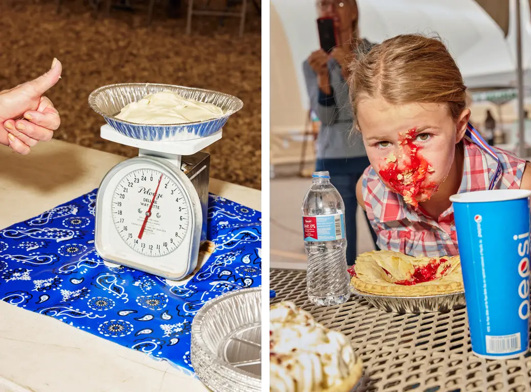 “So many people asked why me, why this tiny town, and I was like that's exactly why! It was difficult to find festivals that have pie-eating contests," she said. "A lot of the fairs are very small, local events, so tracking them down involved a lot of phone calls, researching different competitive food eating websites, fruit-focused festivals (peach, blueberry, cherry festivals, etc.), and county fairs in the West. I talked to so many lovely people, and a few invited me out to photograph their contest.” On July 30, she and her husband hit the road for a 14-day road trip to visit three pie-eating contests.